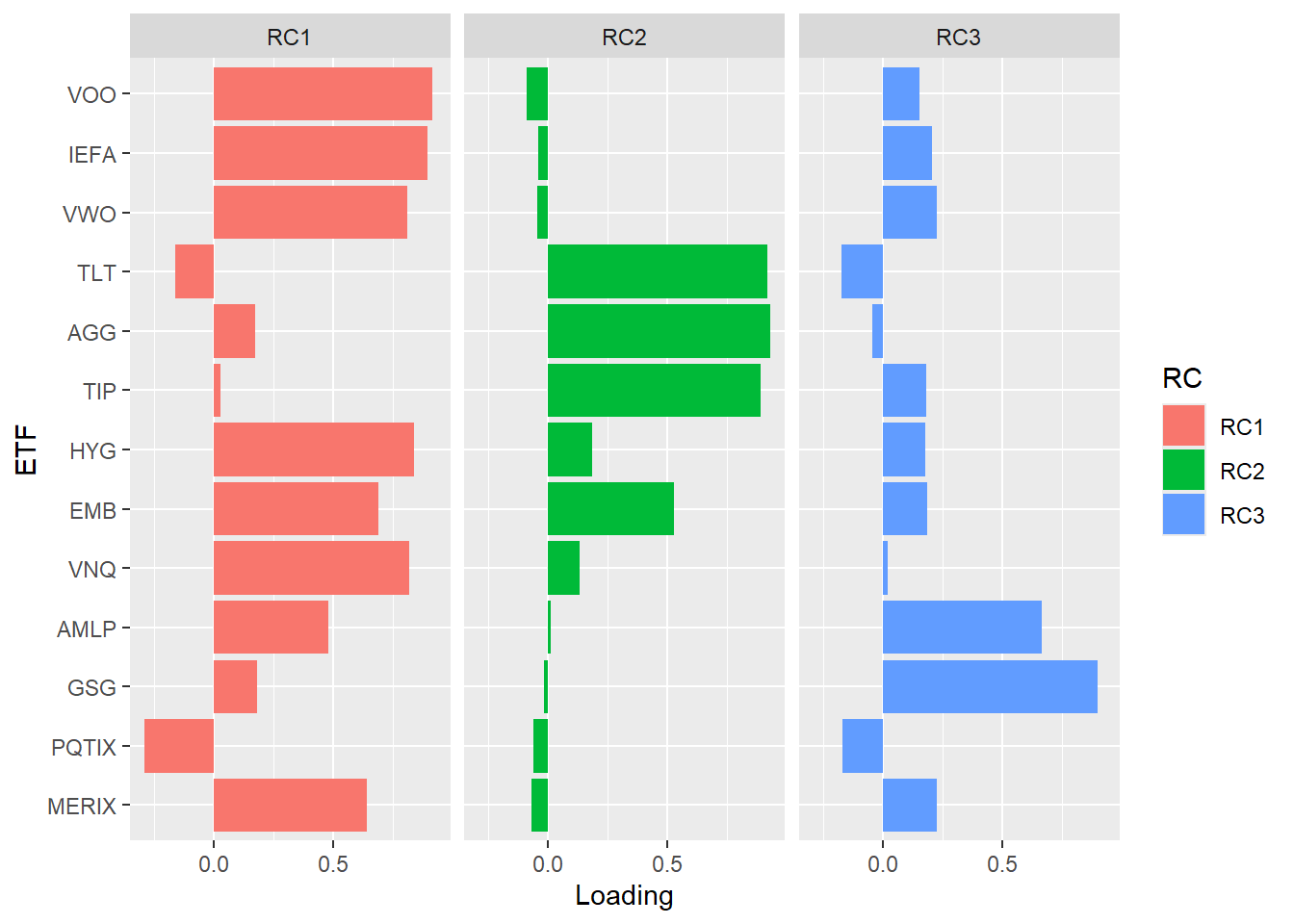 Plotting a bar graph of the three loadings is a helpful way to visualize our groups.