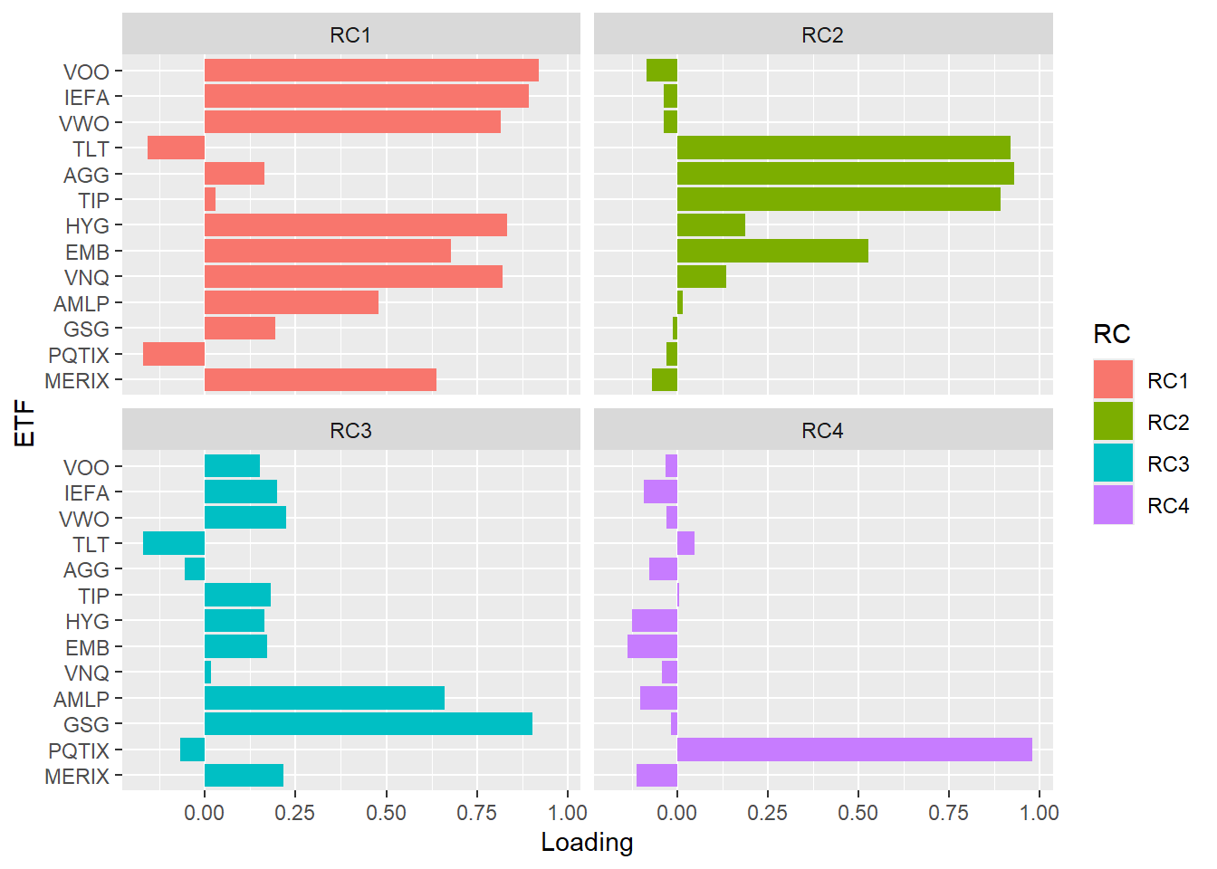 The incremental variance explained wasn’t much, we went from 72% to 79%, but we did create a loading for trend following. Put another way, the fourth component shows that trend following is unique compared to the other asset groups and is essentially its own component. The proportion of explained variance doesn’t increase much because only one additional asset (out of 13) is explained by adding another component, but the component is insightful in that it shows the diversification potential of this asset.